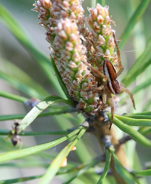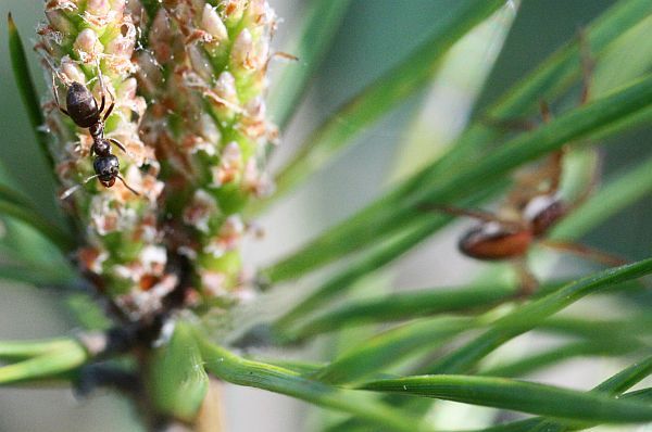 Hämähäkki vaani saalista ja muurahainen kiipeili samassa männyntaimessa.