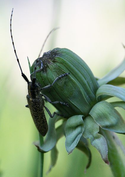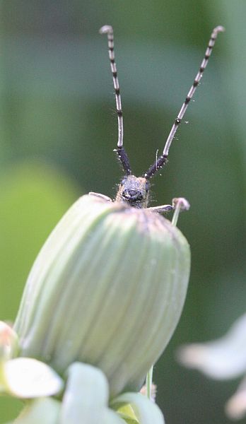 Hauskan näköinen pitkäsarvi kurkisteli voikukan nupulta.