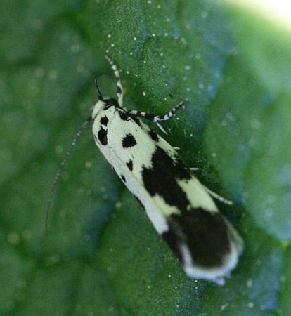 Pieni mustavalkoinen perhonen lepäili lehden varjossa.