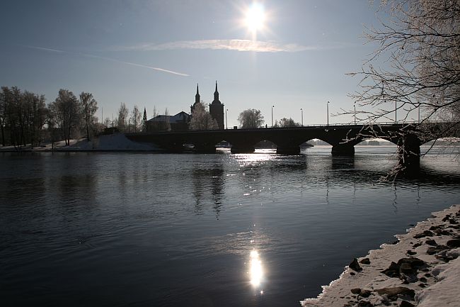 Silta ja kirkko kirjaston puoleiselta rannalta.
