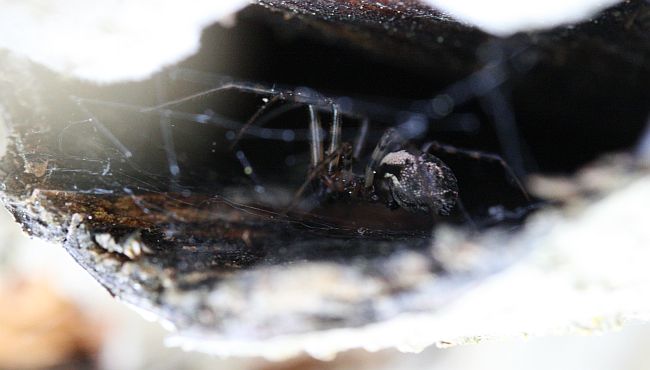 Kuvista selvisikin, että siellä oli pitkäjalkainen hämähäkkipariskunta. Eilisiltana verkko oli kadonnut ja kuoren kolossa paikalla oli enää naaras. Mitä lienee koiraalle tapahtunut: se mitä sanotaan että se helposti joutuu naaraan ateriaksi, vai oliko vain livahtanut matkoihinsa.