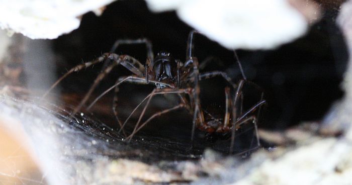 Toissa-iltana (22.5.) tutkiskelin lepässä ollutta suurta hämähäkinverkkorakennelmaa, jossa ei näkynyt ollenkaan hämähäkkiä. Kurkistin myös kuivuneen oksan irrallaan olevan kuoren alle, jossa näyttikin olevan ihan liikaa jalkoja… Koska sinne ei nähnyt kunnolla, oletin että siellä olisi esim. verkon omistavan ilmeisen kookkaan hämähäkin vaihdettuja vanhoja nahkoja. Otin kuitenkin varalta kuvia, että saisin selville mitä siellä oikeastaan oli.