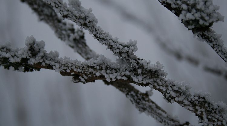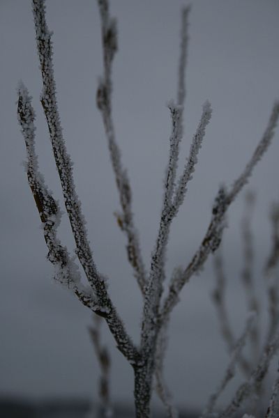 Aurinko pysytteli visusti piilossa tänäänkin. Pakkanen oli hiukan kiristynyt ja lämpötilan muutoksen aiheuttama kuura oli kiinnittynyt kasvillisuuteen hauskasti vain pohjoisen/koillisen/idän puolelle.