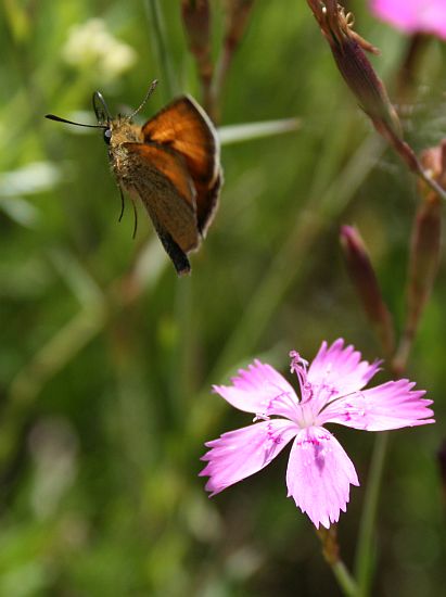 Pientareella kukki tänä kesänä aiempaa runsaammin ketoneilikoita. Pieni perhonen hypähti kukasta ilmaan juuri kuvanottohetkellä.