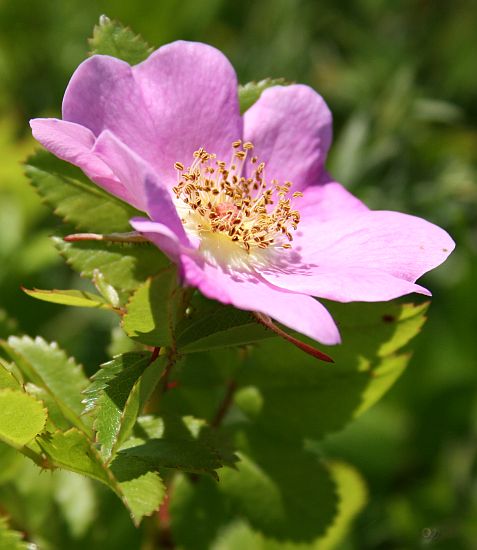 Ojassa kukki pieni, matalana kasvanut villiruusupensas.
