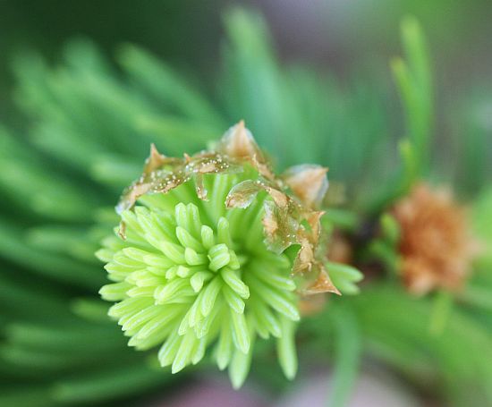 Kuusi availee uusia neulasiaan, jolloin silmujen alkukeväällä ruusumaisilta näyttäneet suojakuoret saavat lähteä.