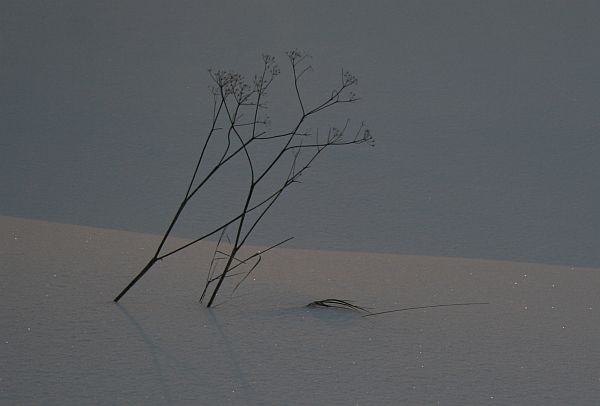 Sinistä varjoa lumella ja kellertävää valoa. Valitettavasti vaan häiritsevän vino kuva...