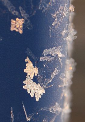 Auringonlaskun valossa postilaatikon kyljen jääkukoistusta.