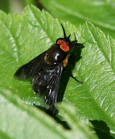 Tummalla kärpäsellä värikkäinä kiiltelevät silmät.