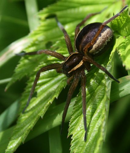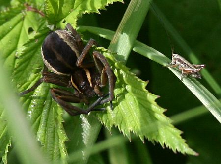 Valtavan suuri (vesi-?)hämähäkki ja pieni hepokatin toukka.