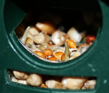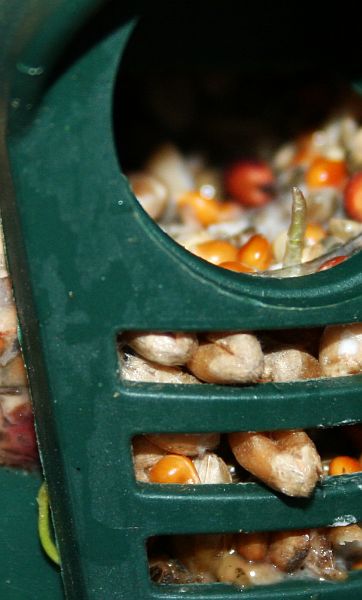 Lisäsin linnuille pähkinöitä ja siemeniä, jolloin huomasin että näissä vaalean siemensekoituksen siemenissä, joista linnut eivät näytä tykkäävän ja pohjimmaiset ovat siksi olleet ruokintalaitteessa jo siitä saakka kun syksyllä aloitin ruokinnan, on alkanut tapahtua. Ne ovat kasvattaneet ituja…