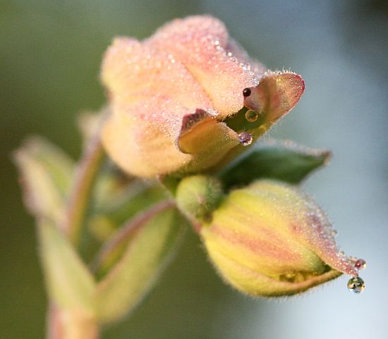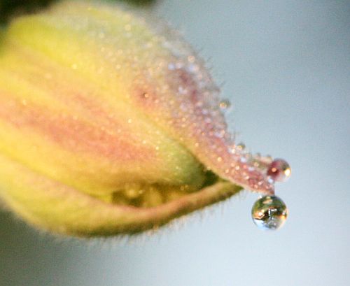Kasteinen akileijan nuppu aamussa.