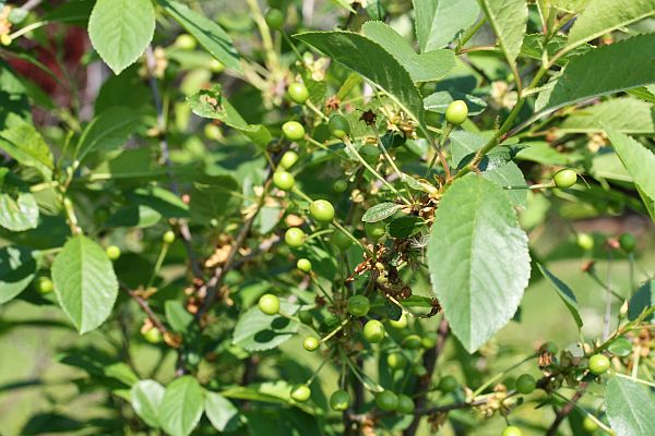 Suklaakirsikkapensaassa on nyt ensimmäistä kertaa näin paljon raakileita.