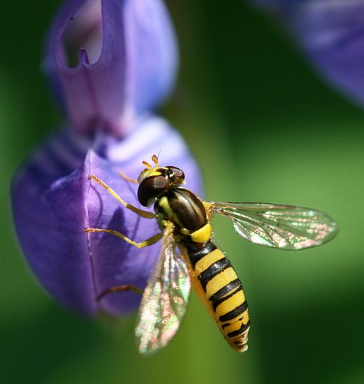 Iltapäivällä kukkakärpänen laskeutui lupiinin kukalle.