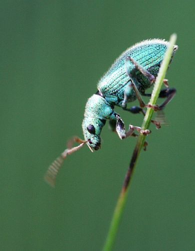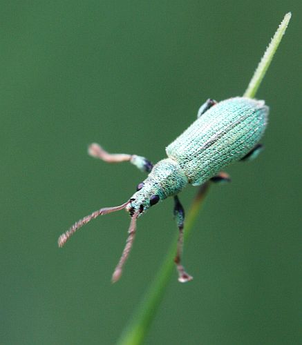Pikkuinen vihreä kuoriainen (lehtikärsäkäs) kiipeili vilkkaasti ruoholla.