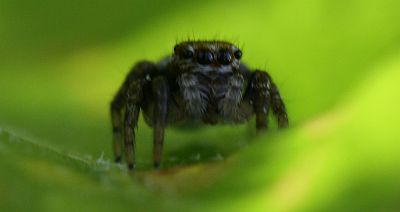 Heikkolaatuinen kuva, mutta siitä erottuu kooltaan pikkuisen hyppyhämähäkin valtavat silmät.