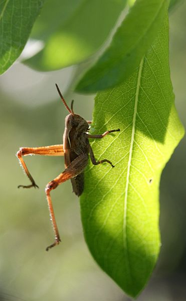 Rauhallisemmin käyttäytyvä täysikasvuinen heinäsirkka katseli minua kielonlehdeltä pitkän tovin.