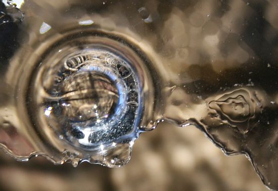 Ohuen jäälevyn reunalle muodostui pisaroita sulamisvedestä. Kuin linssejä.