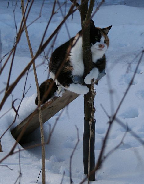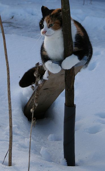 Täällä ollaan! (Ja kynsitään, sekä pureskellaan tukea ja itse omenapuutakin.)