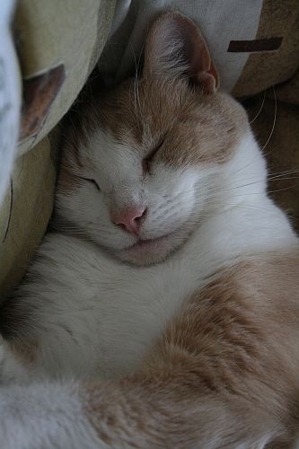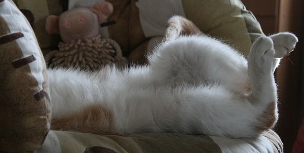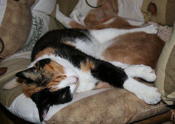 Eilen kissat olivat pakkautuneet tuoliin aika tiiviisti. Huomaa Tilkkutiinan autuas unihymy.