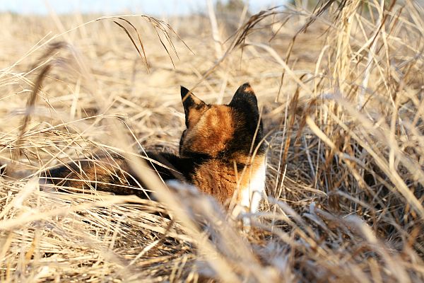 Tilkkutiina lymyili heinikossa. Kauempana oli kai jotain kiinnostavaa..