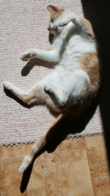 Kun aurinko juhannuspäivänä alkoi paistaa, Kinuski lämmitteli keittiön lattialla aurinkolaikussa.