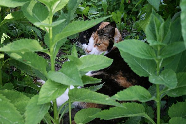 Tilkkutiina viihtyi paremmin varjossa, kukkamaan ja suomentatar-kasvustojen välisessä sopukassa.