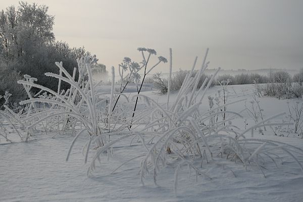 Eilen iloisen solisevina sulamisvettä virranneet jääpuikot olivat saaneet yön aikana kuuraisen höyhenpuvun.