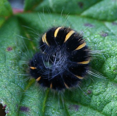 Mustakeltaraidallinen toukka käpertyi kiekoksi.