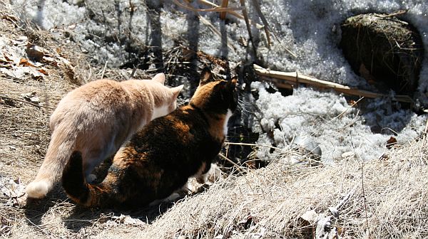 Mikä siellä lorottaa? Ojaan valuva sulamisvesi houkutteli lorinallaan uteliaat tutkijat ojan partaalle.