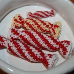 Lisää virkattuja karkkeja. Koska ompelulangasta on vähän vaikeahkoa tehdä, tein karkit tällä kertaa Novita Virkkauslangasta, jolloin niiden kokokin tietenkin samalla suureni. Vertailun vuoksi ompelulankainen karkkikin on mukana kuvassa.