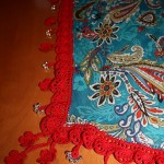 On pitänyt jo pidempään aloittaa tanssihuivia, jonka reunaan virkkaan pitsin ja laitan Tiimarista löytämiäni pikkuisia hopeanvärisiä kulkusia. Eilen kyykötin työn kimpussa monta tuntia, niin että tänään on niska hiukan jäykkänä… Mutta sain työn jo siihen malliin että pääsen virkkaamaan! Pitää keksiä joku kiva pitsimalli, taidanpa nyt käyttää hyväkseni niitä kirjastosta lainattuja virkkausoppaita, vaikka netistäkin löytyisi …
