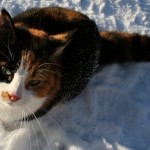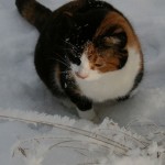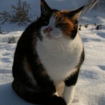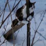 Eilen oli vielä ankea suojasää, mutta illalla alkoi sataa hiukan lunta joka jäi maahan. Tänään oli jo kauniimpaa, vaikka pakkasta ei juuri ollutkaan. Pari arkista kuvaa myös kissojen pihaoleskelusta.