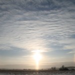 Päivällä huomasin -onneksi- miten melko olemattomista pilvistä hipsui alas pienen pientä lumikidettä ja ne aikaansaivat halo-kaaret jonkin matkaa auringon sivuille. Ulos siis ja muutamia kuvia räpsimään. Aika pian sen jälkeen pilvet valtasivat taivaan ja aurinkoa ei sen jälkeen enää näkynyt, pilvet synkistivät iltapäivän.