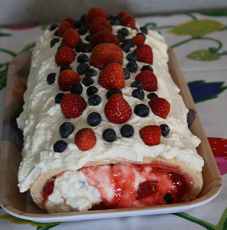 Kääretortussa tuoreita mansikoita ja mustikoita + kermavaahtoa ja maitorahkaa. Täytteen makoisa mansikkahillo on kuitenkin vielä viime vuoden satoa. 🙂