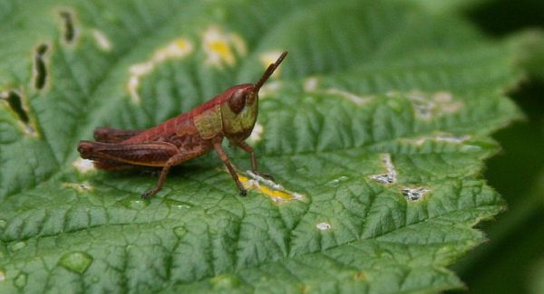 Taas pikkuinen heinäsirkan "toukka". Vadelman lehdellä.