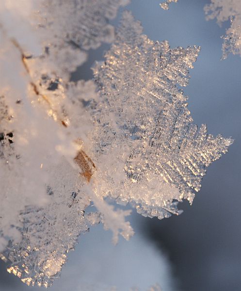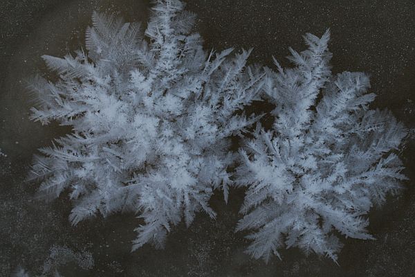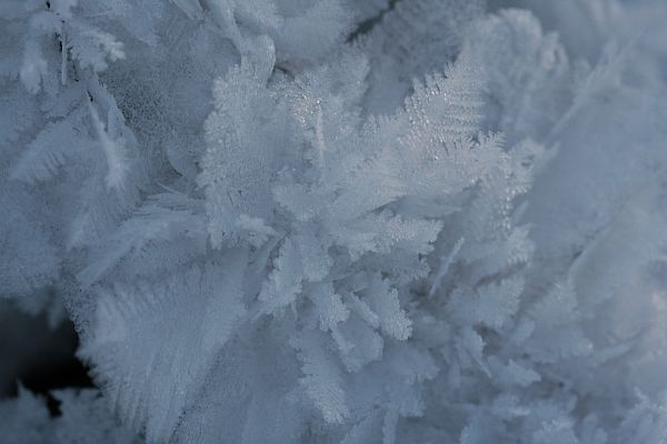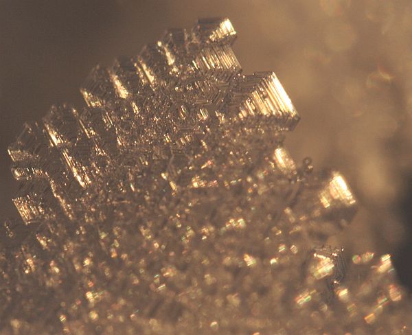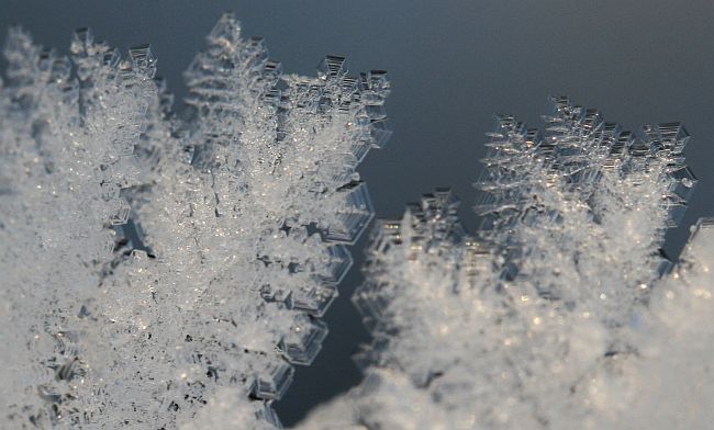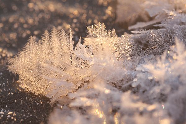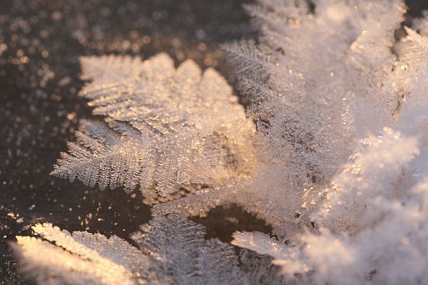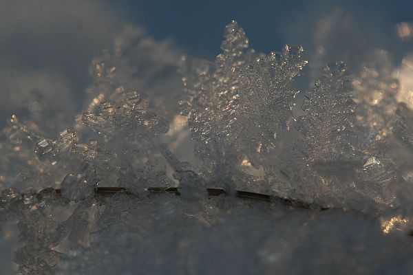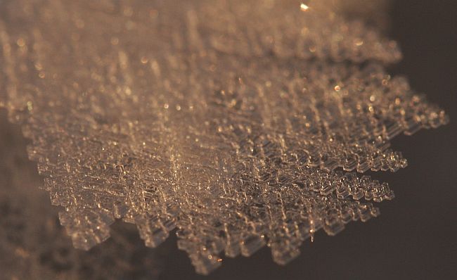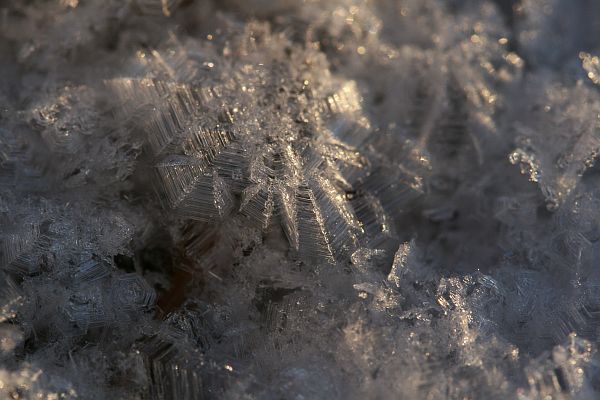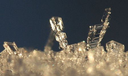 Pieniä kiteitä lumen pinnalla.