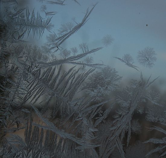 Ikkunaan oli ilmaantunut jääkukkia.