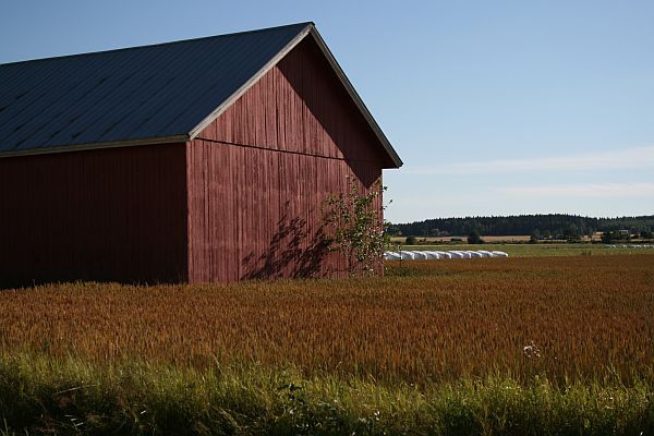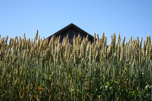 Vehnäpeltomaisemaa ladonnurkalta.