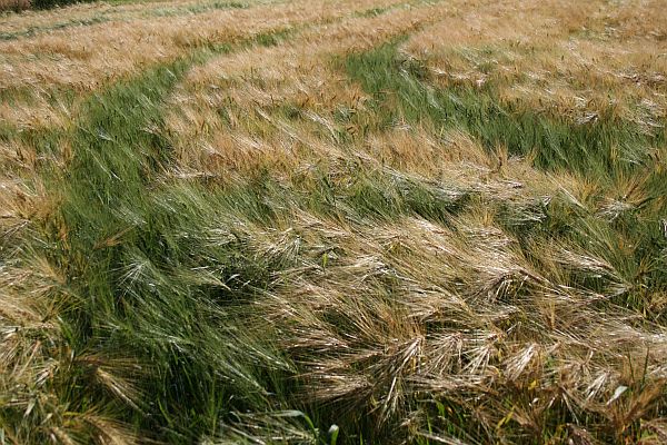 Ohrapelto on melkein kypsää, vain traktorin jälkien kohdalla kasvavat kasviyksilöt ovat vielä vihreinä.