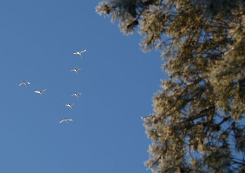 Kerrankin äänettömästi lentävä joutsenparvi. Kuinka satuinkaan huomaamaan ne? Ehkä vaistosin jotakin liikkuvan yläpuolella. Tässä ne ovat jo ehtineet edetä vähän kauemmas. Suunta on etelään päin...