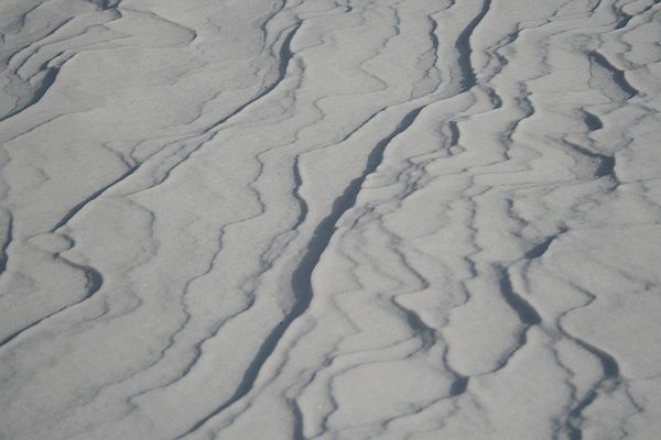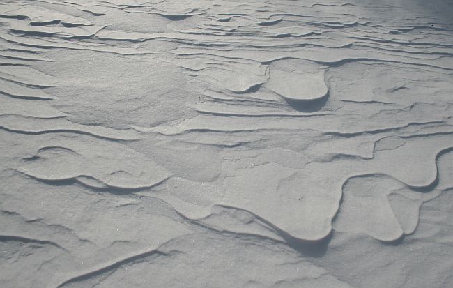 Tällä viikolla puhaltanut kova tuuli muotoili lumen pintaa pellolla.