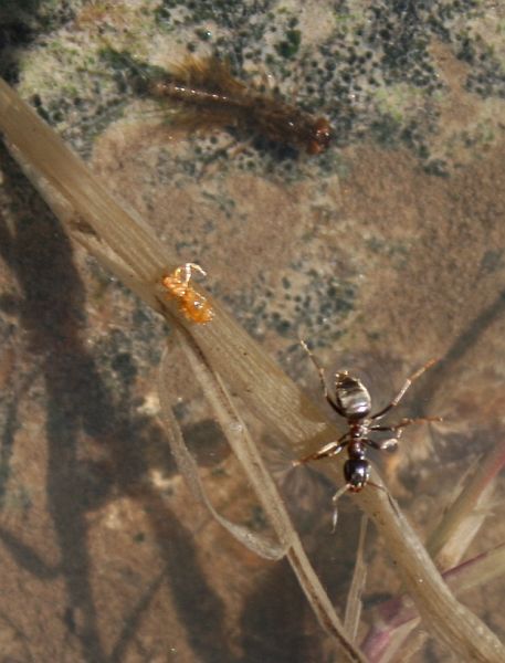 Muurahainen oli joutunut veden varaan. Pinnan alla samanlainen korennontoukka kuin edellisessä kuvassa. Pientä kellertävää otusta en kuvaushetkellä tullut huomanneeksi, näyttää kuin joltakin kirpulta? (Sekä kuolleelta?)