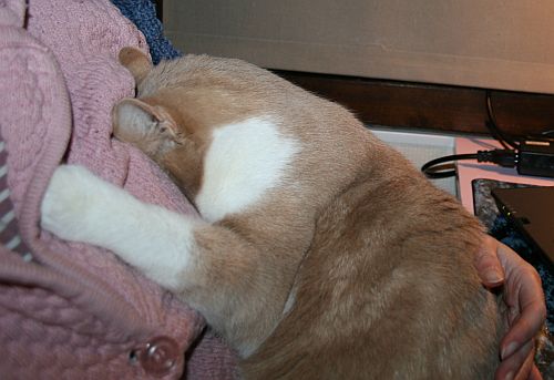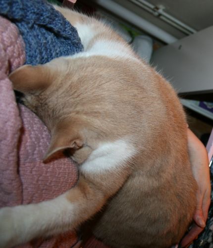 Eilen illalla Kinuski asettautui mielestäni oikeinkin hassuun asentoon sylissäni. Se painoi naamansa lähes kainalooni. 😀