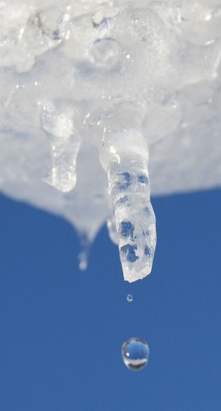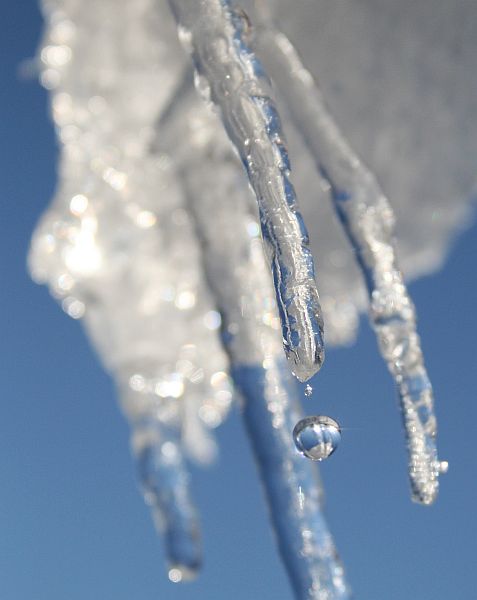 Aurinkoinen päivä sai katonreunan lumen tihkumaan sulaa vettä jääpuikkoja pitkin.
