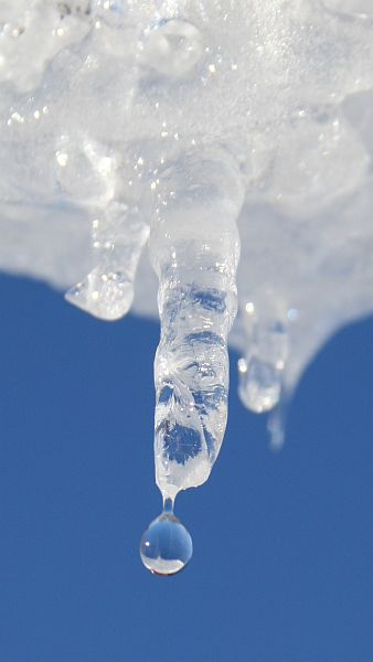 Ulkorakennuksen nurkan roikkuvassa lumilipassa koreili kimppu pienehköjä jääpuikkoja, joita pitkin valui lumesta sulanutta vettä.