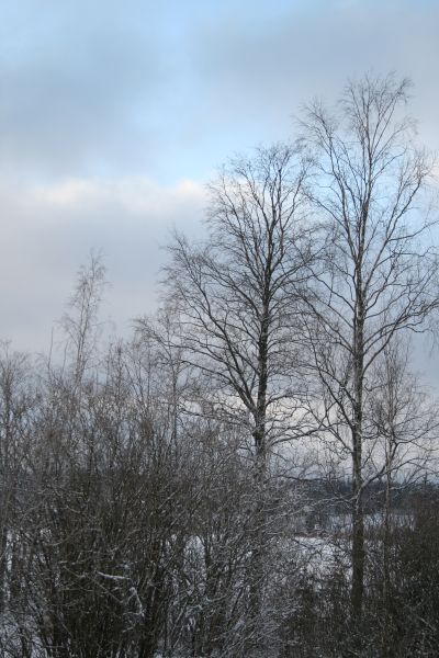 Lumisia puita ja liikkuvaisia pilviä.